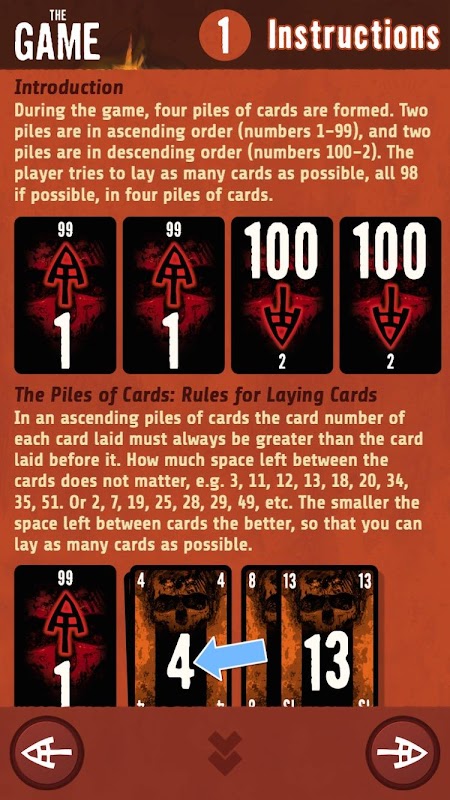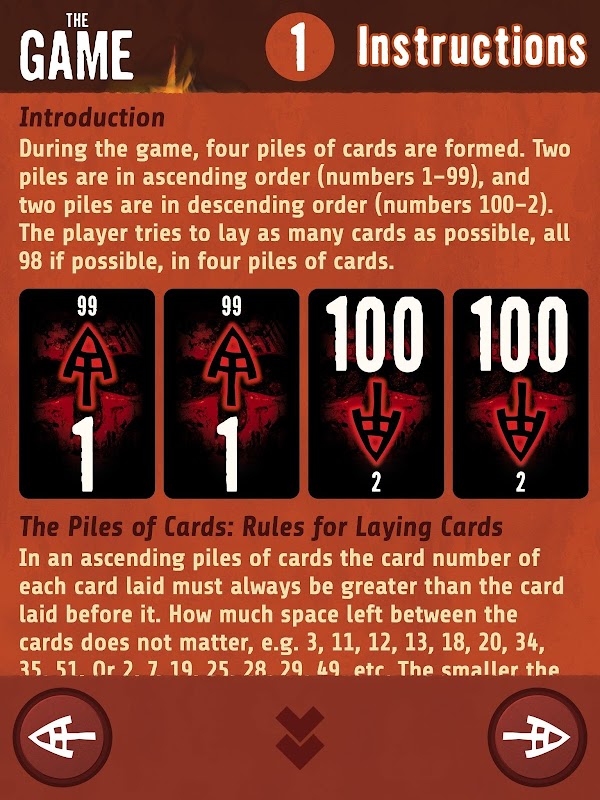 Play ... as long as you can! The Game is you opponent. You can beat it, but even if the rules are very simple - it will not be easy. Think carefully and plan ahead, this is the only way to succeed! During the game, four piles of cards are formed. Two piles are in ascending order (numbers 1–99), and two piles are in descending order (numbers 100–2). The player tries to lay as many cards as possible, all 98 if possible, in four piles of cards.