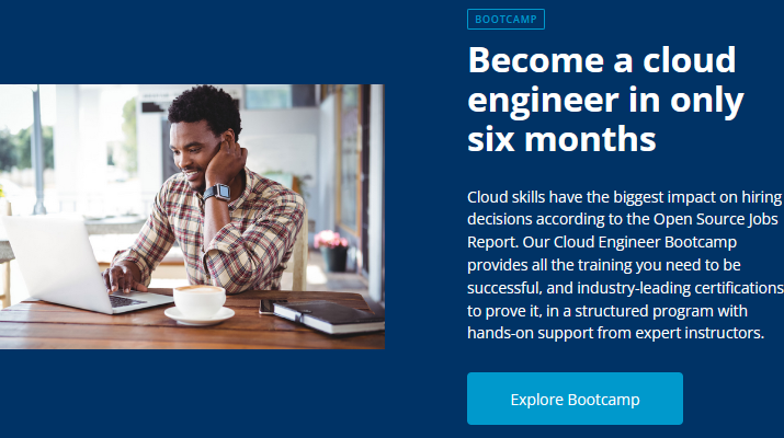 Cloud skills have the biggest impact on hiring decisions according to the Open Source Jobs Report. Our Cloud Engineer Bootcamp provides all the training you need to be successful, and industry-leading certifications to prove it, in a structured program with hands-on support from expert instructors.
