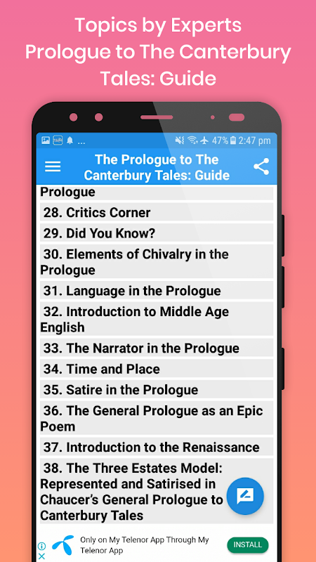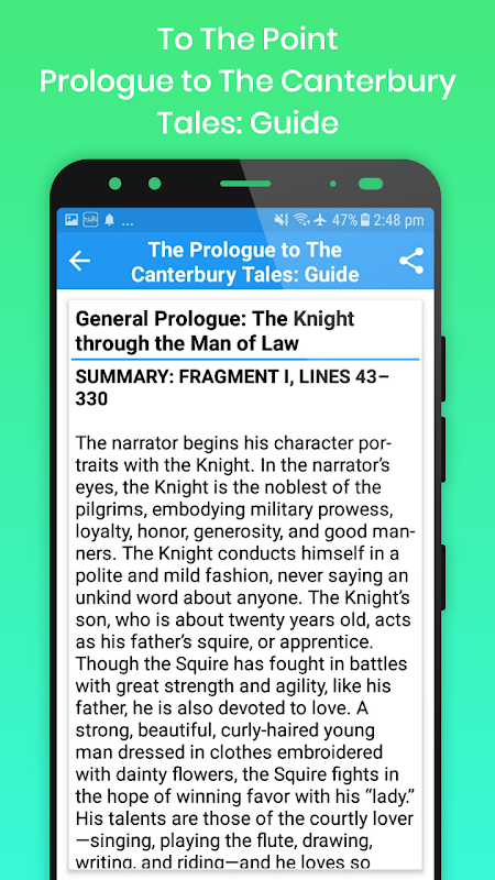 This Guide app works both online and offline, and contains 38 basic topics about one of the famous poem of Geoffrey Chaucer, The Prologue to The Canterbury Tales.