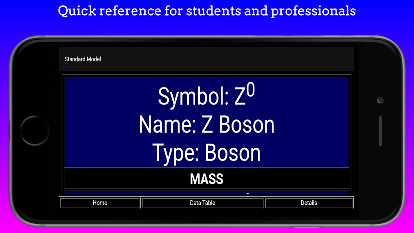 แอปพลิเคชันประกอบด้วยสัญลักษณ์ ประเภท มวล ประจุ การหมุน ปีที่ค้นพบ รุ่น และข้อมูลอื่น ๆ อีกมากมายเกี่ยวกับอนุภาคมูลฐาน