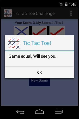 Tic Tac Toe ท้าทายเป็นเกมฟรีสำหรับคนรักเกม, เกมนี้มีสามระดับความยากระดับหนึ่งสำหรับคนเริ่มต้นที่เพียงแค่เริ่มต้นระดับสองเป็นคนปกติและระดับสามสำหรับผู้เชี่ยวชาญที่คิดว่าไม่มีใครสามารถท้าทายพวกเขา นี้เป็นเกมที่มีน้ำหนักเบามากและกลุ่มอายุใดสามารถเข้าใจและเล่นเกมนี้