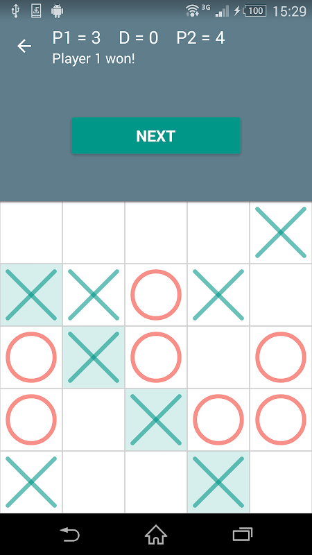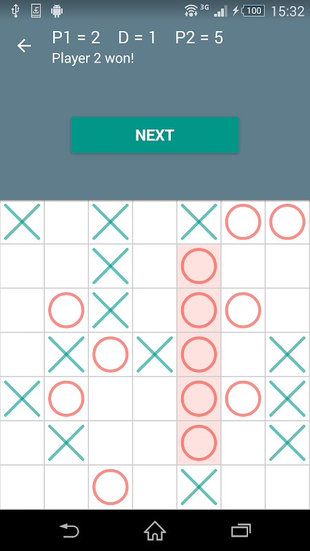 - two players play alternatively, marking one empty cell at a time