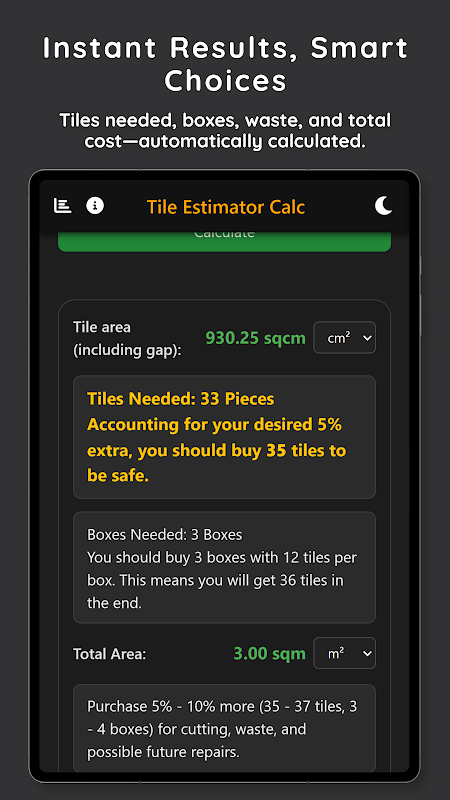 เครื่องคำนวณกระเบื้องอัจฉริยะพร้อมค่าใช้จ่าย พื้นที่ ขยะ และการแบ่งปันภายในไม่กี่วินาที
