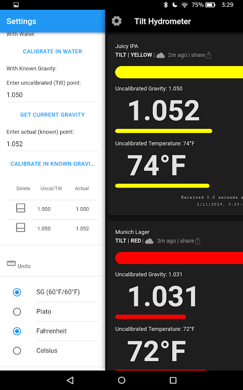 แอป Tilt 2 เป็นแอปอย่างเป็นทางการสำหรับไฮโดรมิเตอร์ TILT ใช้แอปเพื่อบันทึกข้อมูลแรงโน้มถ่วงและอุณหภูมิที่เฉพาะเจาะจงไปยังระบบคลาวด์ เช่น Google ชีตหรือปลายทางระบบคลาวด์ที่กำหนดเองอื่นๆ เราสนับสนุน brewfather.app, brewstat.us, monitor.log และ Grainfather.com เป็นต้น (เยี่ยมชมเว็บไซต์ที่เกี่ยวข้องเพื่อรับข้อมูลเพิ่มเติมเกี่ยวกับการตั้งค่าแอพ) คุณยังสามารถเข้าสู่ระบบโทรศัพท์หรือแท็บเล็ตได้โดยตรง และส่งอีเมล CSV ถึงตัวคุณเองหรือผู้อื่น โปรดทราบว่าเมื่อทำการบันทึก คุณจะต้องอยู่ภายในระยะ Tilt ของคุณ หรือมีโทรศัพท์หรือแท็บเล็ตติดตั้งถัดจากถังหมักเพื่อการบันทึกอย่างต่อเนื่องโดยอัตโนมัติ (แนะนำเป็นอย่างยิ่ง!). คุณยังสามารถสอบเทียบความเอียงและเปลี่ยนหน่วยจากองศาฟาเรนไฮต์เป็นเซลเซียสและจากความถ่วงจำเพาะ (60°F/15.6°C) เป็นองศาเพลโต