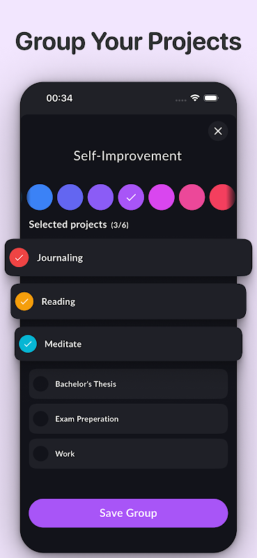 จัดระเบียบโครงการออกเป็นกลุ่มต่างๆ เช่น "งาน" "เรียน" หรือ "ส่วนตัว" เพื่อให้มีสมาธิจดจ่อและจัดการเวลาอย่างมีประสิทธิภาพ