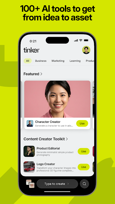 Tinker brings together tools from leading AI providers including OpenAI, Google, Anthropic, Black Forest Labs, xAI, Kling, and more. As new models launch, Tinker integrates them so your creative toolkit is always fresh without having to find, evaluate, or pay for them separately.