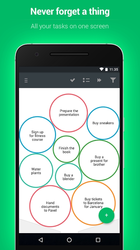 You simply add bubbles with task names to the visual planner and then watch them go down the funnel when you mark tasks as done. It is very convenient to keep tasks that need to be done soon in the funnel, so you can always see how much there is to do. When you see the funnel of task manager is packed full and understand that something has to be done later, you can put tasks off – they will be removed from the funnel and you can pick the date when they need to show up in the funnel again. There is also a classic to-do list view for current, pending, and completed tasks.