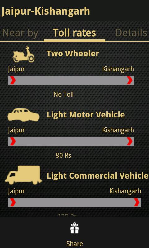 Next screen will display the cost for each plaza for Cars/Jeep, Trucks/Bus and Motorbikes. The settings screen lets you to choose vehicle type for getting toll rates.