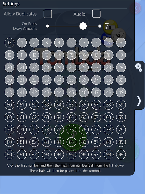 คุณสามารถเลือกหมายเลขลูกบอลได้ตั้งแต่ 0 ถึง 99 และเลือกได้ว่าต้องการให้มีหมายเลขซ้ำกันในการจับฉลากอีกด้วย คุณสามารถเลือกลูกบอลที่คุณต้องการวาดได้โดยใช้หน้าการตั้งค่า เพียงแค่คลิกที่ลูกบอลแรก จากนั้นคลิกที่ลูกบอลที่สอง