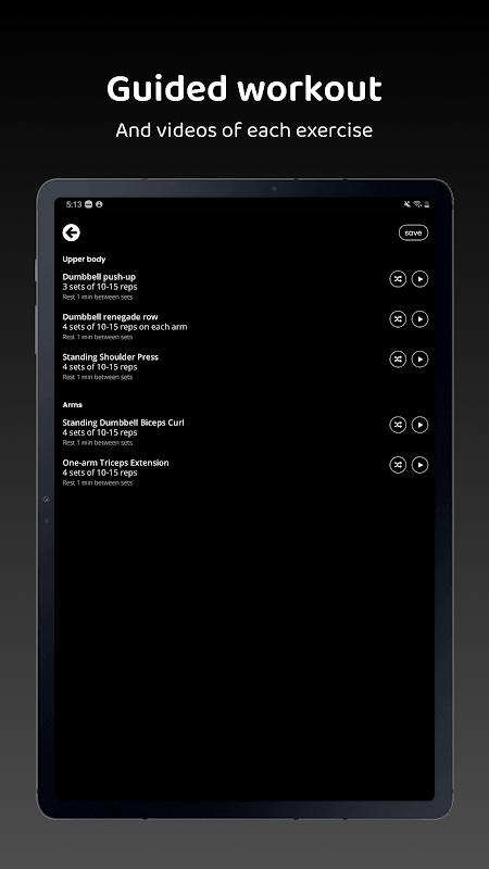 ด้วยแอปนี้ คุณสามารถสร้างการออกกำลังกายดัมเบลล์ที่บ้านตามเป้าหมายและกลุ่มกล้ามเนื้อที่คุณเลือก แบบฝึกหัดที่เลือกมาอย่างดีจะแนะนำให้คุณ คุณสามารถเปลี่ยนการออกกำลังกายแต่ละรายการได้หากจำเป็น การออกกำลังกายทั้งหมดจะต้องใช้ดัมเบลล์