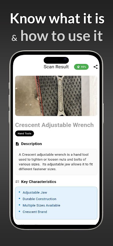 ค้นพบ จดจำ และเรียนรู้เกี่ยวกับเครื่องมือช่างได้ทันที ไม่ว่าคุณจะเป็นผู้ที่ชื่นชอบงาน DIY ช่างยนต์ ช่างไม้ ช่างก่อสร้าง หรือนักศึกษา แอปจดจำเครื่องมือ AI อันทรงพลังของเราจะช่วยให้คุณระบุเครื่องมือและเข้าใจการใช้งานที่ถูกต้องได้ภายในไม่กี่วินาที