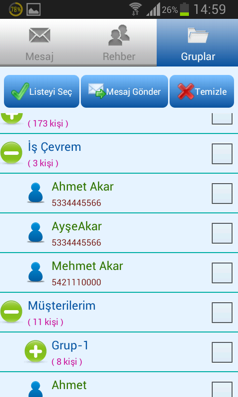 firma ünvanınız veya isminizle toplu sms gönderebilir ve rehberinizdeki kişileri mesaj gönderme programına aktarabilirsiniz.