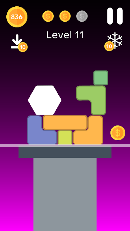 Hexagon Fall - Endless Puzzle Game. Don't fall and keep going down: this is the main goal of this amazing game. In the game you are challenged to stay on the top of the tower of various shaped brick upon which rests a hexagon block. The aim is to get the hexagon down the tower as further as possible. You do this by tapping on the bricks to make them disappear bringing the hexagon down into the space cleared underneath.