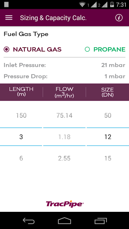 App นี้จะช่วยให้ผู้ใช้ขนาดสินค้าที่มีความยืดหยุ่นก๊าซTracPipe®ท่อโดยใช้วิธีการปรับขนาดที่เหมาะสม ต่างแสดงขนาดที่เหมาะสมของTracPipe®สำหรับความจุที่กำหนดขึ้นอยู่กับชนิดของก๊าซแรงดันและความดันลดลงอนุญาตเลือกโดยผู้ใช้ โดยการเลือกพารามิเตอร์การออกแบบโดยใช้แบบเลื่อนลงเมนูง่ายผู้ใช้แล้วเลือกความยาวของท่อและขนาดท่อบนง่ายต่อการอ่านล้อเครื่องคิดเลข, ความจุในการค้นหาความสามารถในการจัดส่งโดยใด ๆ ของเจ็ดขนาดที่นำเสนอโดยTracPipe®
