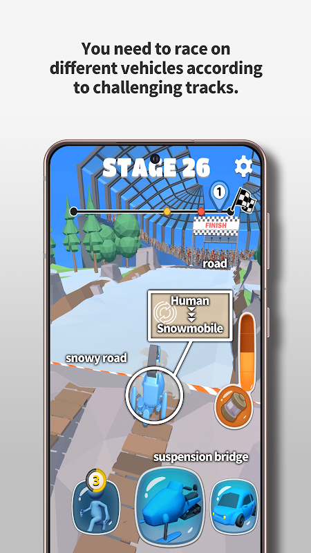 เลือกยานพาหนะที่เหมาะสมสำหรับแต่ละเส้นทางแข่งขัน มนุษย์: บันได ลิฟต์ กำแพงหิน สะพานแขวน สะพานไม้ซุง