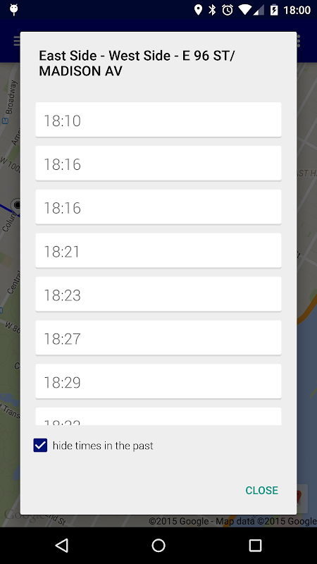 - คุณสามารถขอกำหนดเส้นทางสำหรับเส้นทาง MTA ใดก็ได้โดยป้อนหมายเลข สามารถดูตารางเวลาเป็นตารางต้นทาง/ปลายทางหรือบนแผนที่ได้ บนแผนที่ ดูว่ารถบัส/รถไฟขบวนถัดไปมีกำหนดมาถึงเมื่อใดโดยแตะป้ายหยุด ดูเวลาทั้งหมดของการแวะนั้นโดยแตะที่หน้าต่างข้อมูลที่ปรากฏขึ้น