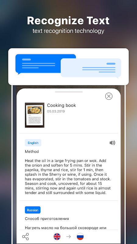 Translate Photo uses the latest in-depth neural network, combined with cloud image recognition technology, to recognize text from images with high accuracy and translate it to multiple languages.