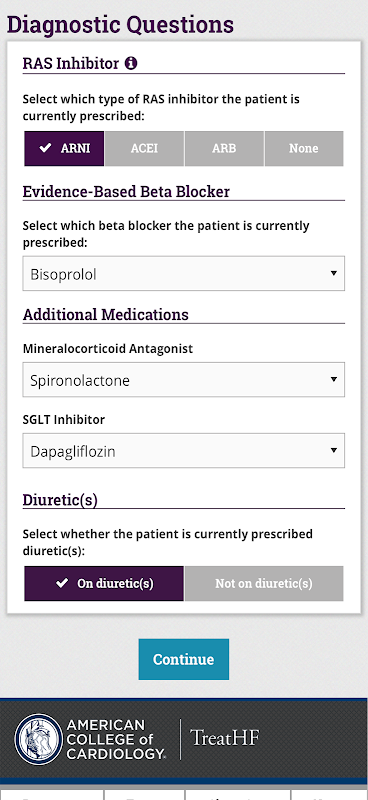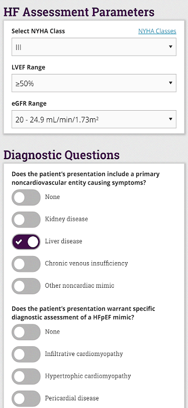 เนื้อหาในแอปนี้มาจากแนวทางการจัดการภาวะหัวใจล้มเหลวของ AHA/ACC/HFSA ปี 2022 เส้นทางการตัดสินใจของผู้เชี่ยวชาญ ACC ประจำปี 2023 เกี่ยวกับการจัดการภาวะหัวใจล้มเหลวที่มีเศษส่วนการบีบตัวของหัวใจที่คงอยู่ และเส้นทางการตัดสินใจของผู้เชี่ยวชาญ ACC ประจำปี 2024 สำหรับการรักษาภาวะหัวใจล้มเหลวที่มีเศษส่วนการบีบตัวของหัวใจที่ลดลง ข้อมูลและคำแนะนำในแอปสนับสนุนการตัดสินใจทางคลินิกนี้ไม่ได้มีจุดมุ่งหมายเพื่อนำเสนอแนวทางการรักษาที่ดีที่สุดหรือเพียงอย่างเดียว หรือทดแทนการตัดสินใจทางคลินิก ทางเลือกในการรักษาควรได้รับการพิจารณาหลังจากการหารือระหว่างผู้ป่วยและผู้ให้บริการดูแลของตน