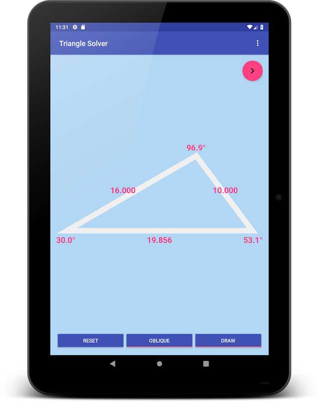 Triangle Solver คำนวณและแก้รูปสามเหลี่ยมทุกชนิด รูปสามเหลี่ยมด้านขวาและรูปสามเหลี่ยมเฉียงจะได้รับการสนับสนุน Triangle Solver คำนวณทั้งสามเหลี่ยมจากข้อมูลของผู้ใช้ เพียงแค่คลิกที่ด้านข้างหรือมุมที่คุณต้องการเติมผลการค้นหาจะปรากฏในรูปสามเหลี่ยมปกติ แต่ยังสามารถวาดรูปสามเหลี่ยมที่มีอัตราส่วนด้านขวา