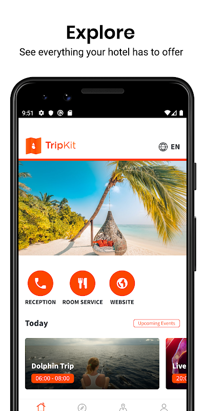 TripKit ช่วยให้คุณได้รับประโยชน์สูงสุดจากการเข้าพักที่โรงแรมและรีสอร์ทในเครือ TripKit คุณสามารถดูรายละเอียดทั้งหมดเกี่ยวกับอสังหาริมทรัพย์และจองกิจกรรมและคำขอของคุณ คุณสามารถเรียกดูทุกสิ่งที่โรงแรมมีให้ในส่วนต่อประสานที่สะดวกและใช้งานง่าย