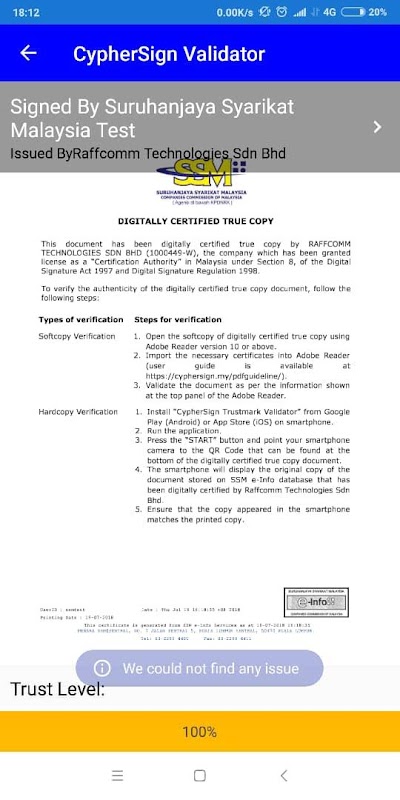 Validate hard copy and soft copy of certified true copy documents that are signed by RaffComm Technologies, CypherSign.