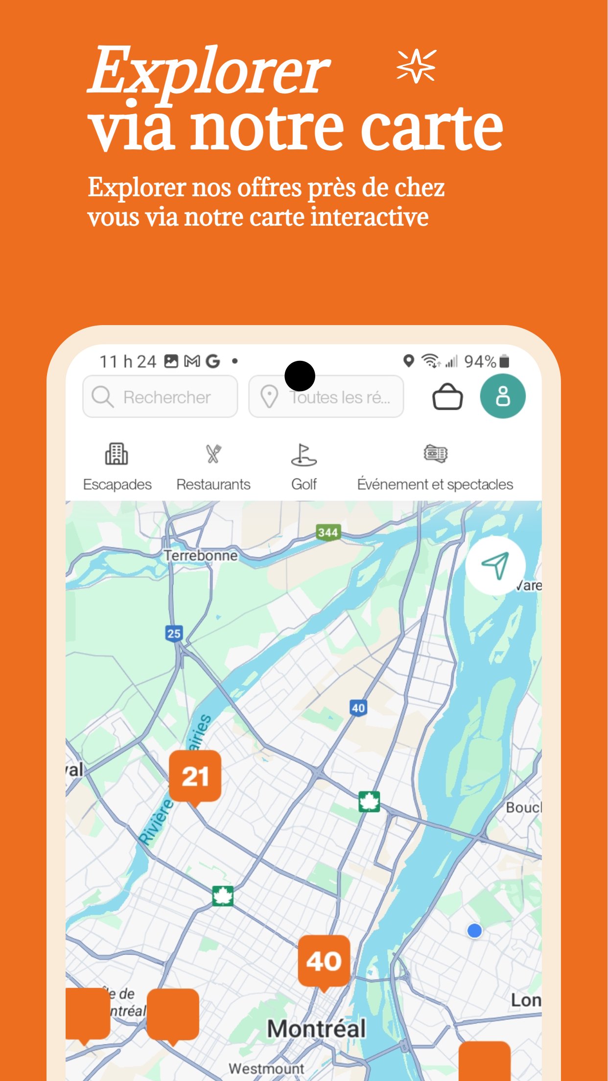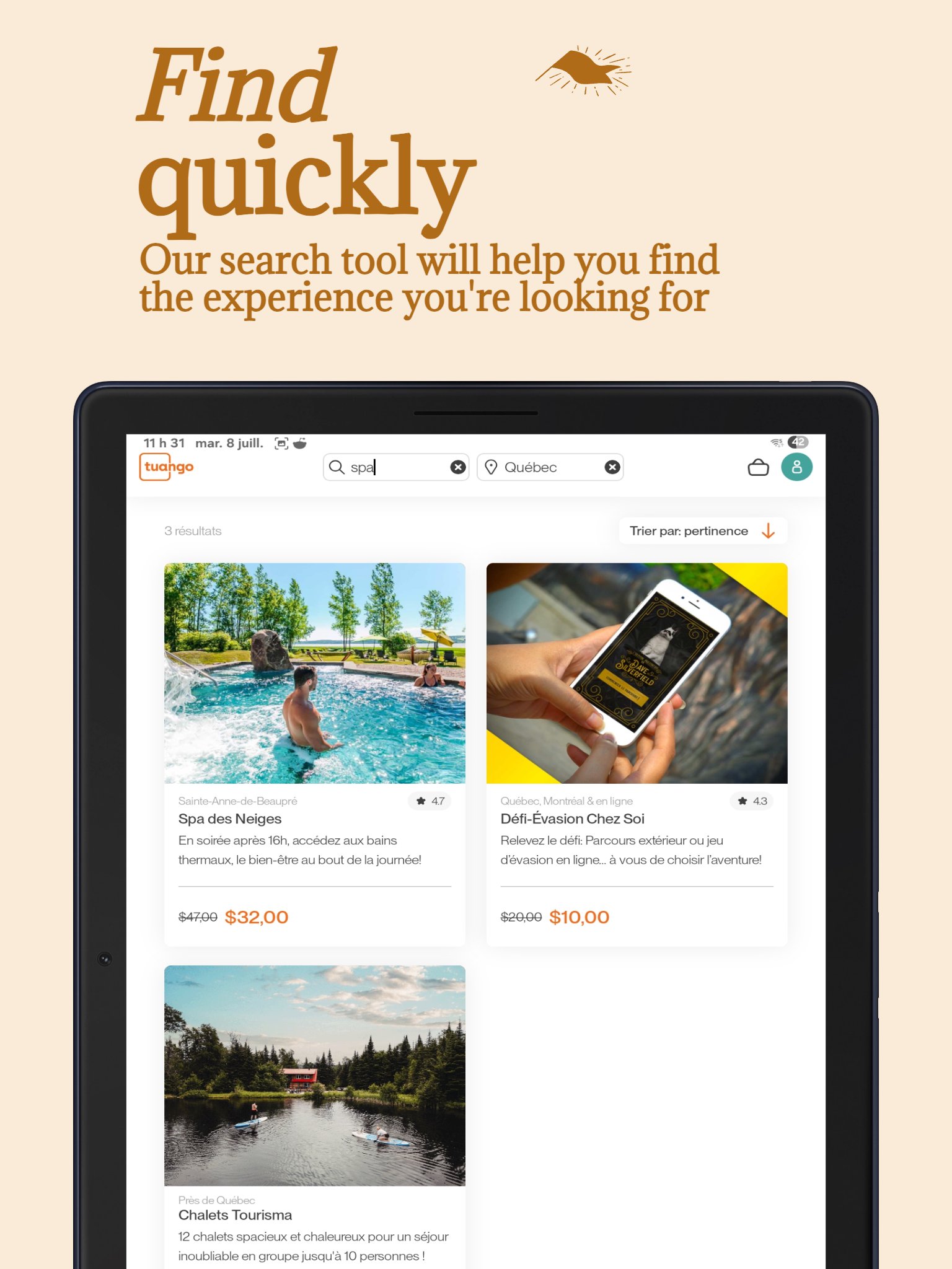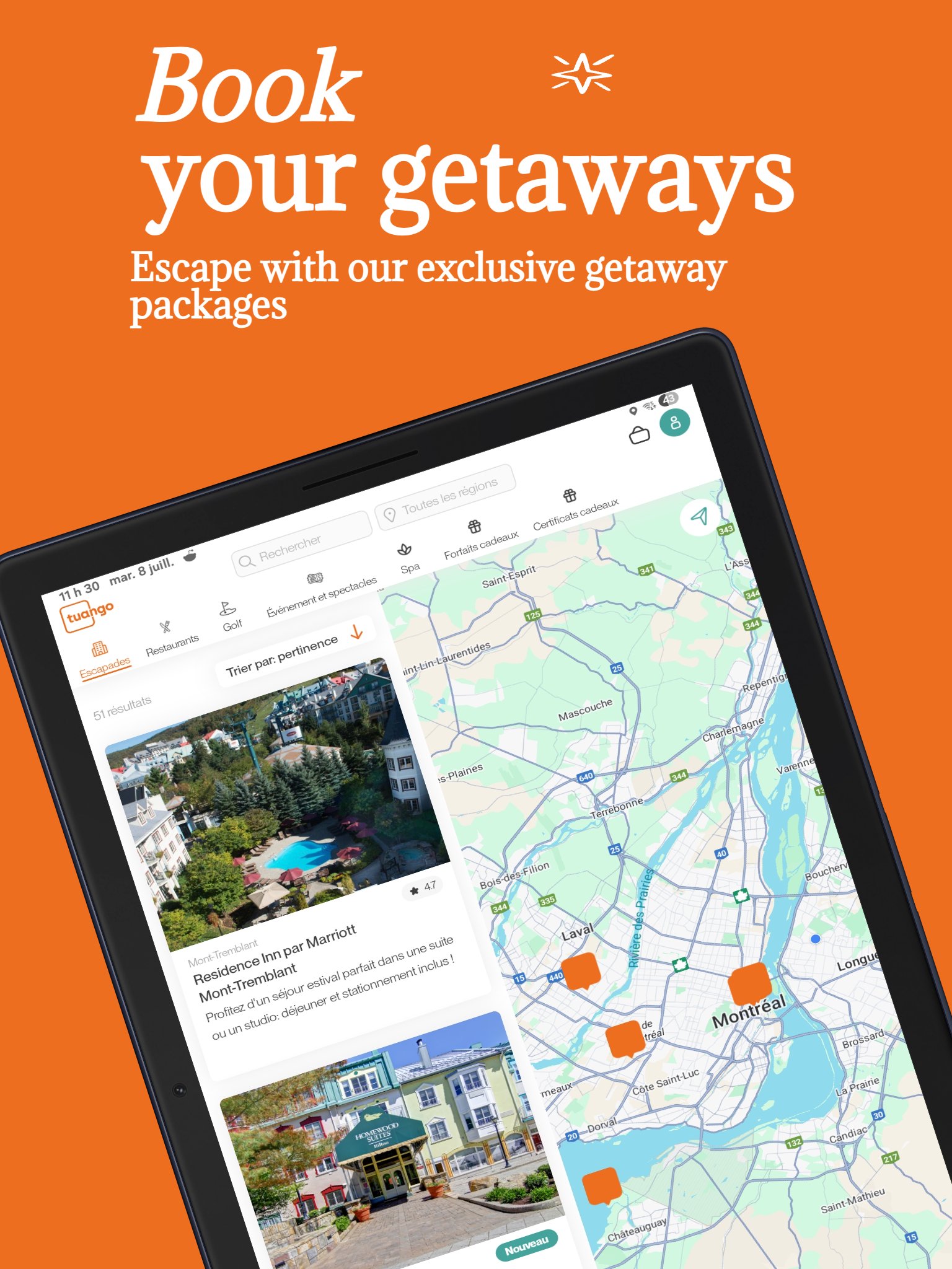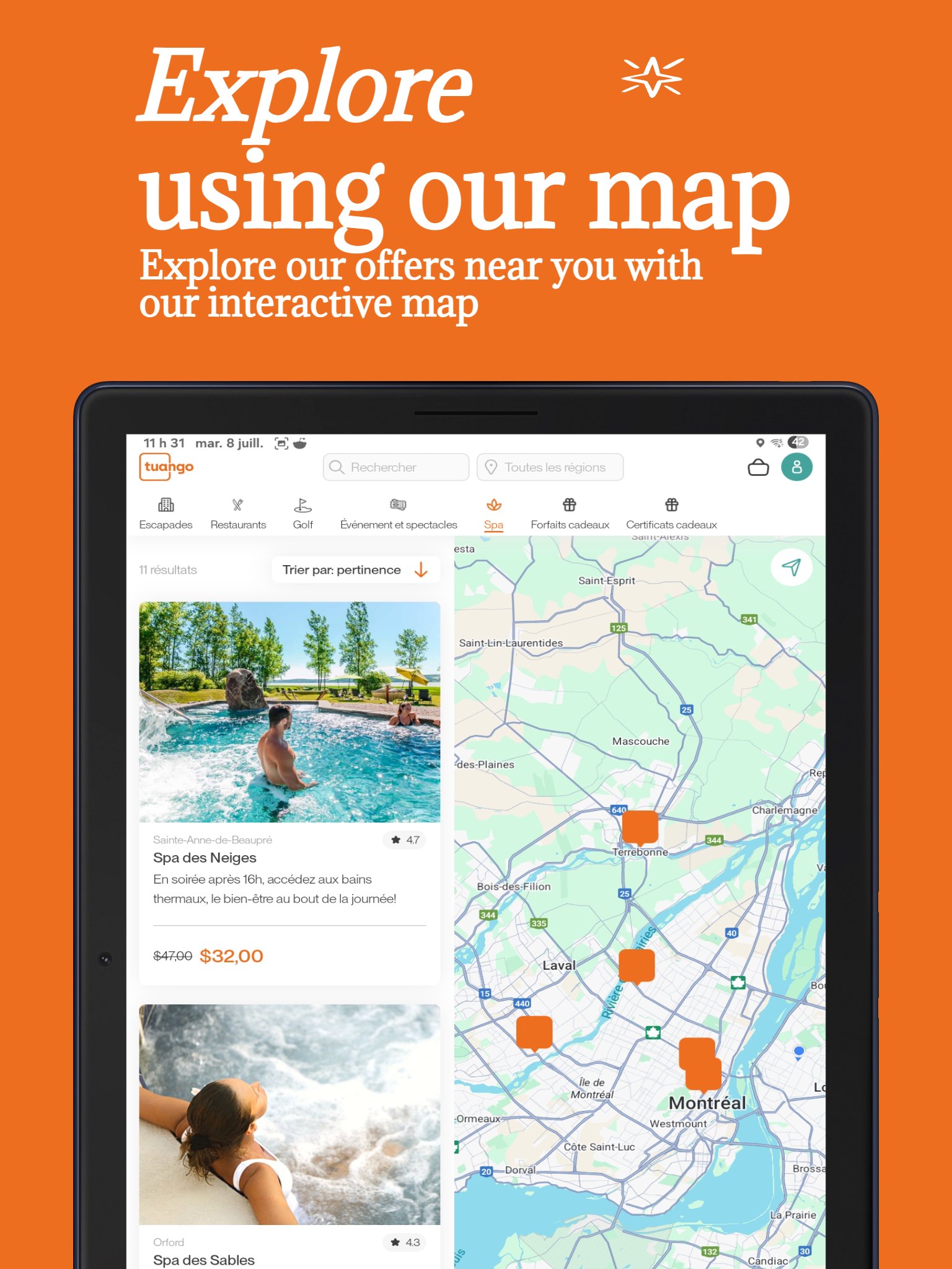 กว่า 15 ปีแล้วที่ Tuango มอบข้อเสนอสุดพิเศษให้คุณค้นพบทั่วควิเบก ด้วยแอปใหม่ล่าสุดนี้ คุณสามารถค้นหาสปา การแสดง สถานที่พักผ่อน ร้านอาหาร กิจกรรม และอื่นๆ อีกมากมายได้อย่างง่ายดาย แอปใหม่นี้ไม่ได้มีไว้สำหรับคุณเท่านั้น คุณยังสามารถเข้าถึงฟีเจอร์มากมาย: