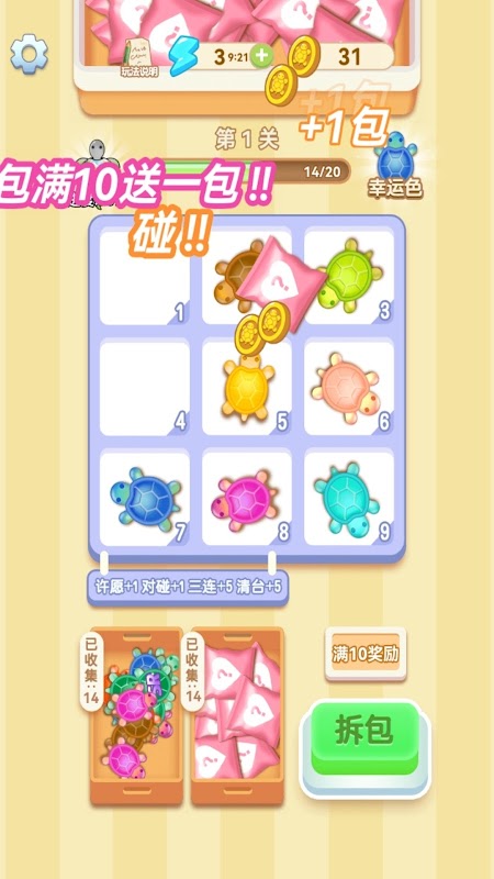 คุณต้องรวบรวมเต่าที่มีสีเดียวกันสามตัวเพื่อผ่านด่านต่างๆ อย่างต่อเนื่อง