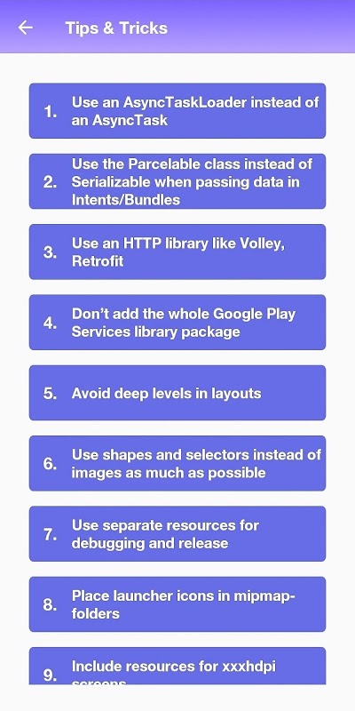 แอปพลิเคชั่นประกอบด้วยหกหมวดหมู่หลักที่กล่าวถึงด้านล่างหมวดหมู่ที่ครอบคลุมแนวคิดพื้นฐานที่สำคัญเช่นทุกประเภทของรูปแบบ, ปุ่ม, มุมมอง, ชิ้นส่วน, กิจกรรม, เจตนาและคำถามสัมภาษณ์