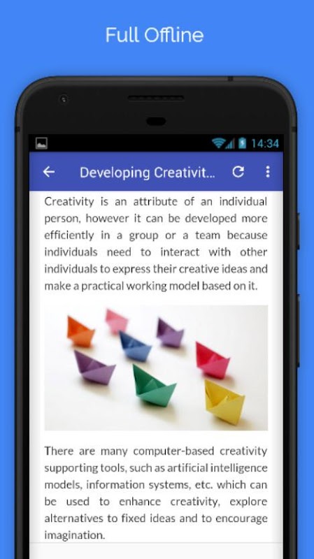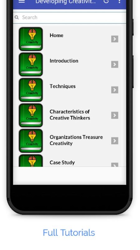 Tutorials for Developing Creativity Offline is a complete application for those of you who want to learn Developing Creativity easily and for free. There are dozens and even hundreds of Developing Creativity tutorials starting to base for beginners to advanced. All these tutorials you can read offline without the need to connect to the internet or mobile data.