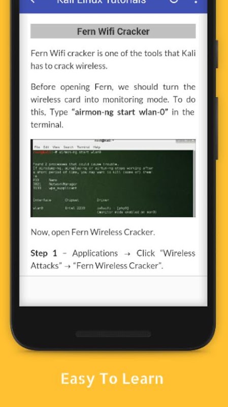 Tutorials for Kali Linux Offline is a complete application for those of you who want to learn Kali Linux easily and for free. There are dozens and even hundreds of Kali Linux tutorials starting to base for beginners to advanced. All these tutorials you can read offline without the need to connect to the internet or mobile data.