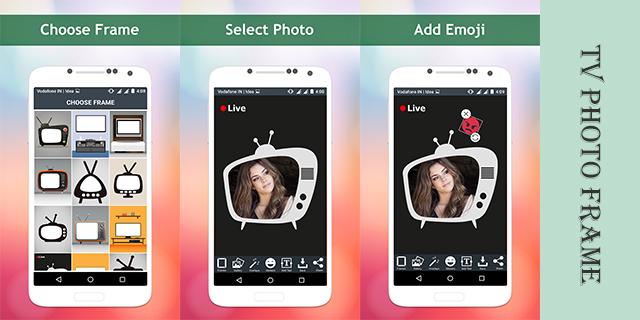 Tv photo frame with a friendly interface, simple design, easy to use, with just a few simple steps as choose frame, select photo, rotate, zoom in, zoom out, move, effects, emoji, sticker, save and share it