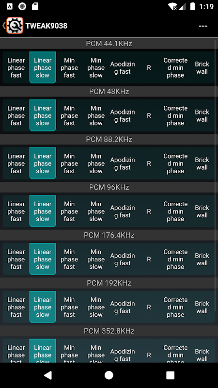 Tweak9038 ช่วยให้คุณควบคุมการชดเชยความผิดเพี้ยนของฮาร์มอนิกส์การเลือกตัวกรองของ Nyquist ความถี่ MasterClock และอื่น ๆ พารามิเตอร์เหล่านี้ส่วนใหญ่สามารถกำหนดได้แบบไดนามิกขึ้นอยู่กับระดับเสียง HW ของอัตราข้อมูลเสียงเป็นต้นกล่าวอีกนัยหนึ่งคือสร้าง DAC ตาม ES9038Q2M ของคุณเองและบันทึกไว้ เป็นค่าที่ตั้งไว้ล่วงหน้า (เพื่อแบ่งปันค่าที่ตั้งไว้นี้)!