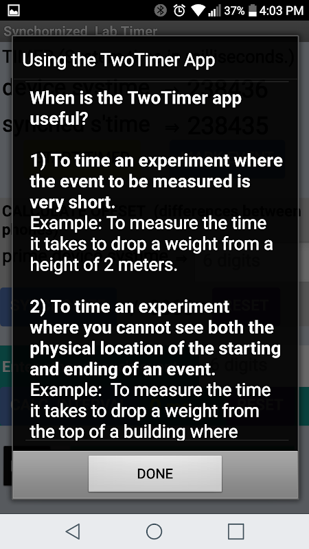 In both of these cases TwoTimer allows one person (or a group each with its own phones) to observe and record the start of an experimental event. A second person/group will record the event's end. Then the event duration can be calculated by subtracting the event's end time from the event's start time.