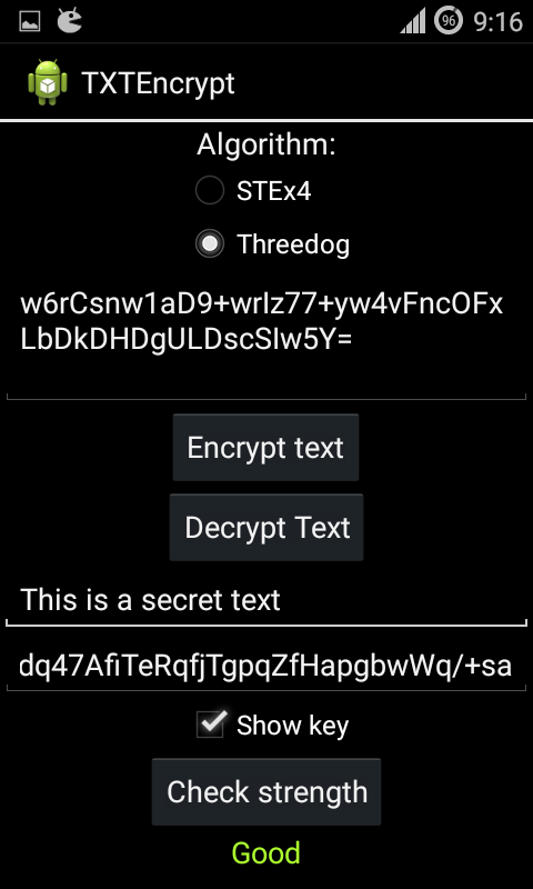 You can encrypt and decrypt text with this application. There are three encryption algorithms, Threedog is the strongest and STEx4 is the weakest, but it is a bit faster.
