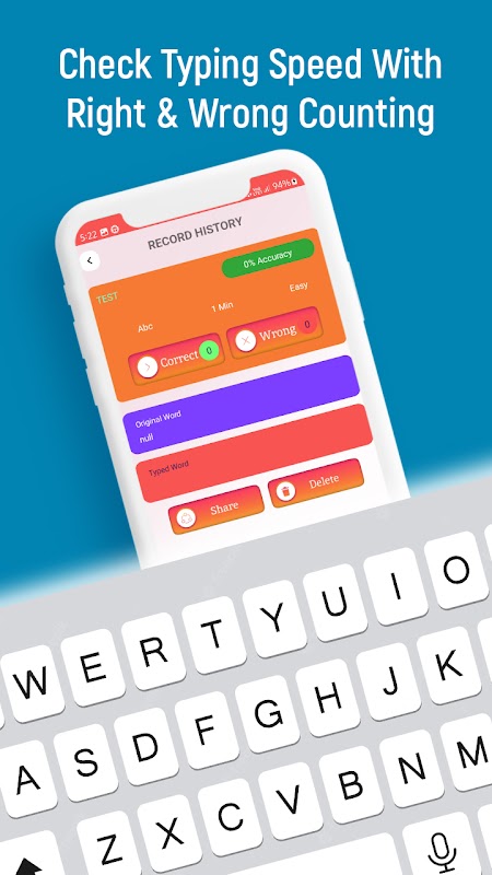 แอปทดสอบความเร็วในการพิมพ์มีประโยชน์ในการทดสอบ/วัดความเร็วในการพิมพ์ของผู้ใช้ เรียนรู้การพิมพ์และค้นหาว่าคุณพิมพ์ได้เร็วแค่ไหน แอปมีชุดบทเรียนการพิมพ์ฟรีมากมายพร้อมตัวเลือกต่างๆ เช่น การพิมพ์แบบยาก/ปานกลาง/ง่าย เพื่อฝึกพิมพ์ออนไลน์และเรียนรู้การพิมพ์ มีการเน้นตัวอักษรเพื่อช่วยให้คุณจดจ่อกับการพิมพ์ คุณสามารถเป็นผู้เชี่ยวชาญการพิมพ์ด้วยความช่วยเหลือของแอพนี้ หรือสามารถเล่นเกมการพิมพ์เพื่อความสนุกสนาน คุณต้องเพิ่มแป้นพิมพ์เฉพาะภาษาเพื่อพิมพ์ในภาษานั้น แอพนี้มีความท้าทายในการพิมพ์สำหรับย่อหน้าที่พิมพ์ซึ่งคุณต้องพิมพ์ ตัวนับเวลาขึ้นอยู่กับความยาวของอักขระในย่อหน้า คุณต้องพิมพ์คำให้ได้มากที่สุดภายในกรอบเวลา & คะแนนจะถูกนับในรูปแบบคำต่อนาที คำที่ถูกต้องแต่ละคำจะถูกเพิ่มเข้าไปในคะแนนของคุณและจะไม่นับคำที่พิมพ์ผิด หากคุณต้องการพิมพ์บนโทรศัพท์ให้ดียิ่งขึ้นอยู่เสมอ การทดสอบความเร็วในการพิมพ์เป็นเครื่องมือที่ดีที่สุดสำหรับคุณ ด้วยความช่วยเหลือของมัน คุณสามารถเรียนรู้ที่จะพิมพ์ได้อย่างเป็นธรรมชาติและผลลัพธ์จะน่าทึ่งมาก แอปพลิเคชันติวเตอร์การพิมพ์นี้จัดทำขึ้นสำหรับคนทุกวัย ทุกประสบการณ์ และทุกความสามารถ เกมทดสอบความเร็วในการพิมพ์และแอปทดสอบหลักความเร็วในการพิมพ์ภาษาฮินดีสำหรับการทดสอบความเร็วในการพิมพ์แป้นพิมพ์คอมพิวเตอร์ ความท้าทายในการทดสอบความเร็วในการพิมพ์ด้วยการทดสอบความเร็วในการพิมพ์บนมือถือหรือการทดสอบความเร็วในการพิมพ์ภาษามราฐี คุณยังสามารถบันทึกผลการทดสอบของคุณเป็นประวัติเพื่อใช้อ้างอิงในอนาคต