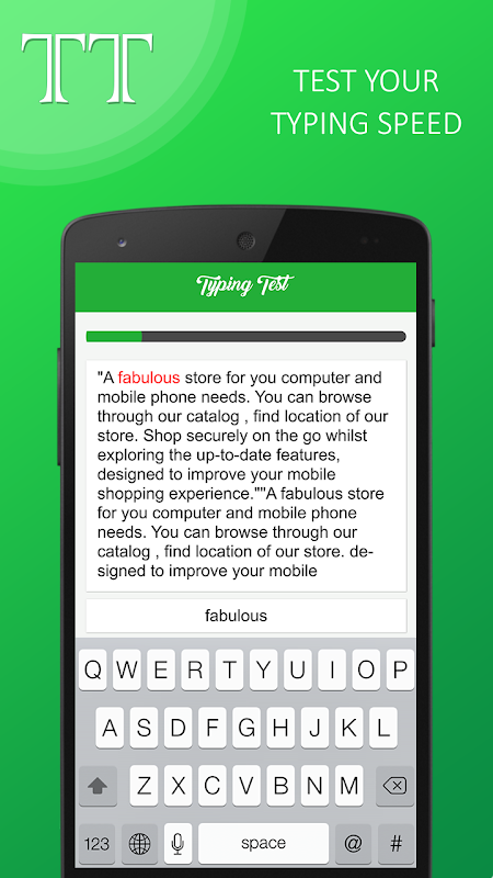 Typing Test is a app to improve your typing skills naturally as you go alone will help. A variety of words to type it as you see fit, and it will be able to rapidly increase its purity allows. After working with many words to see, typing will be fun and different each and every time.