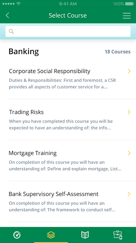 คุณสามารถเข้าถึงหลักสูตร (SCORM 1.2 และ HTML 5) ในหมวดหมู่ต่างๆและการประเมิน (ฝังอยู่ในหลักสูตร) ผ่านแอพ