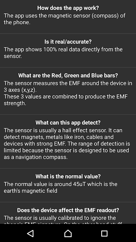 แอพนี้ใช้เซ็นเซอร์แม่เหล็ก (เข็มทิศ) ของโทรศัพท์ของคุณและแสดงการอ่านด้วยเส้น LED และมาตรวัดแบบเข็มแบบคลาสสิก คุณสามารถสลับระหว่างหน่วยการวัด (uTesla และ Gauss) และเปลี่ยนช่วงการวัดได้จากการตั้งค่า