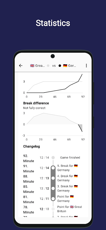 - Player stats (Goals & Assists) can be entered after "Player Stats" button is activated - New offense/defense indicator for every point - Final game result can be entered directly if live scoring is not desired - Game notes can be added to games - Game clock can be adjusted - Preview: Participants can add photos to tournaments - Halftime can be defined in the tournament settings - French translation added - Small bugfixes