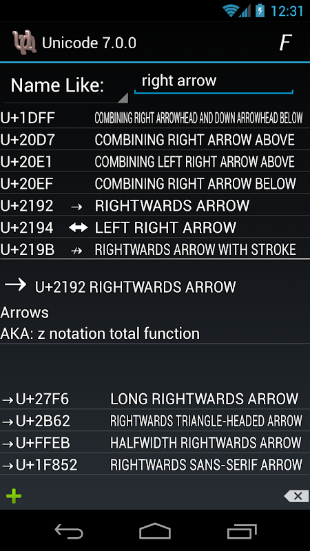 Browse the Unicode character set, examining characters by category or by similarity; search for names containing specified substrings; save a list of favourites for quick reference. Also copy and paste text between this and other Android applications.