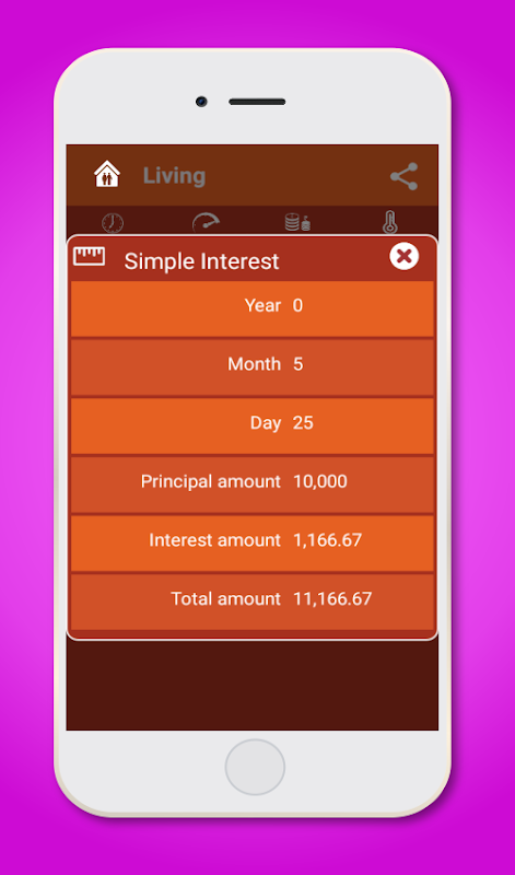 Living - In this living group of our free Unit Converter app user can find the details of TIME (Millisecond, Second, Year, Month, etc.,), SPEED (Meter/Second, Foot/Second, Mile/Hour, etc.,), INTEREST (It has two levels of calculation one has simple interest and other was a compound interest), TEMP (Celsius, Fahrenheit etc.,)