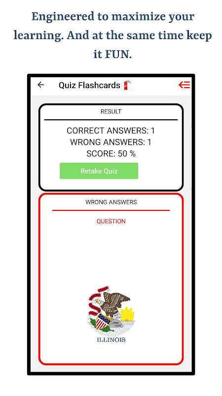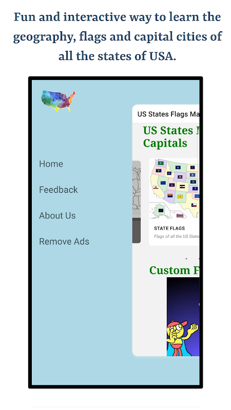 มี 50 รัฐในสหรัฐอเมริกา แอปนี้จะช่วยให้คุณจดจำธง แผนที่ และเมืองหลวงของรัฐเหล่านี้ เพื่อประโยชน์ของการมีส่วนร่วมของผู้ใช้และกระตุ้นความอยากรู้ของพวกเขา แอปนี้ถูกสร้างขึ้นในรูปแบบของ flashcards สำหรับ ส่วนธง ธงของรัฐจะแสดงที่ด้านหนึ่งของบัตรคำ และชื่อของรัฐจะแสดงที่อีกด้านหนึ่งของบัตรคำ . ในทำนองเดียวกันสำหรับ ส่วนเมืองหลวงและส่วนแผนที่ ชื่อของรัฐและแผนที่จะแสดงที่ด้านหน้าของบัตรคำศัพท์ และแสดงชื่อเมืองหลวงและรัฐ อีกด้านหนึ่งของแฟลชการ์ดตามลำดับ ต่อไปนี้เป็นคุณสมบัติหลักที่สำคัญของแอพและเราพยายามอย่างเต็มที่เพื่อเพิ่มคุณสมบัติมากขึ้นเรื่อย ๆ