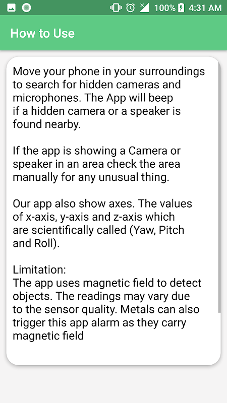 Detect Hidden Camera and Microphone app uses device's magnetometer sensor to detect the devices around you, and warns you if it finds a camera or microphone or a recording device nearby.