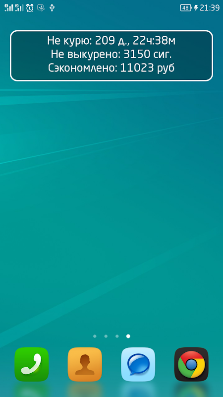 Введите дату, когда Вы бросили курить, введите стоимость пачки сигарет и введите количество скуриваемых сигарет в день, а также вы можете ввести свои затраты на устройства/жидкости и расходники. Приложение всё рассчитает и выведет в виджет. Не забудьте добавить виджет на один из рабочих столов!