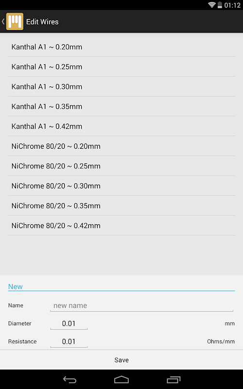 Rapidly save your builds and load any of them back at a later time, so you can get your perfect build for each atomizer and quickly recall it when you need to re-build. All of the selections you have made are saved along with the build, including which battery you were using.