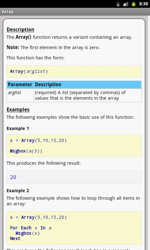The VBScript properties/functions are categorized and searchable. Each detailed information screen contains a description, syntax, parameters, examples, and more. In addition, most of the examples include the actual output.