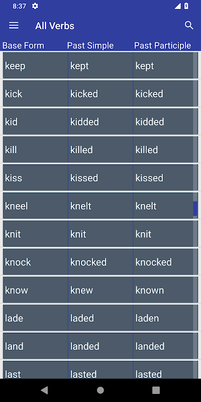 แอพแบบฟอร์มกริยาภาษาอังกฤษมีกริยาภาษาอังกฤษที่สำคัญมากกว่า 1,000 รายการ กริยารูปแบบ App แสดง 3 รูปแบบของกริยา V1, V2 และ V3 ใช้เวลาสองสามนาทีทุกวันโดยใช้แอพและปรับปรุงความรู้ของคุณ
