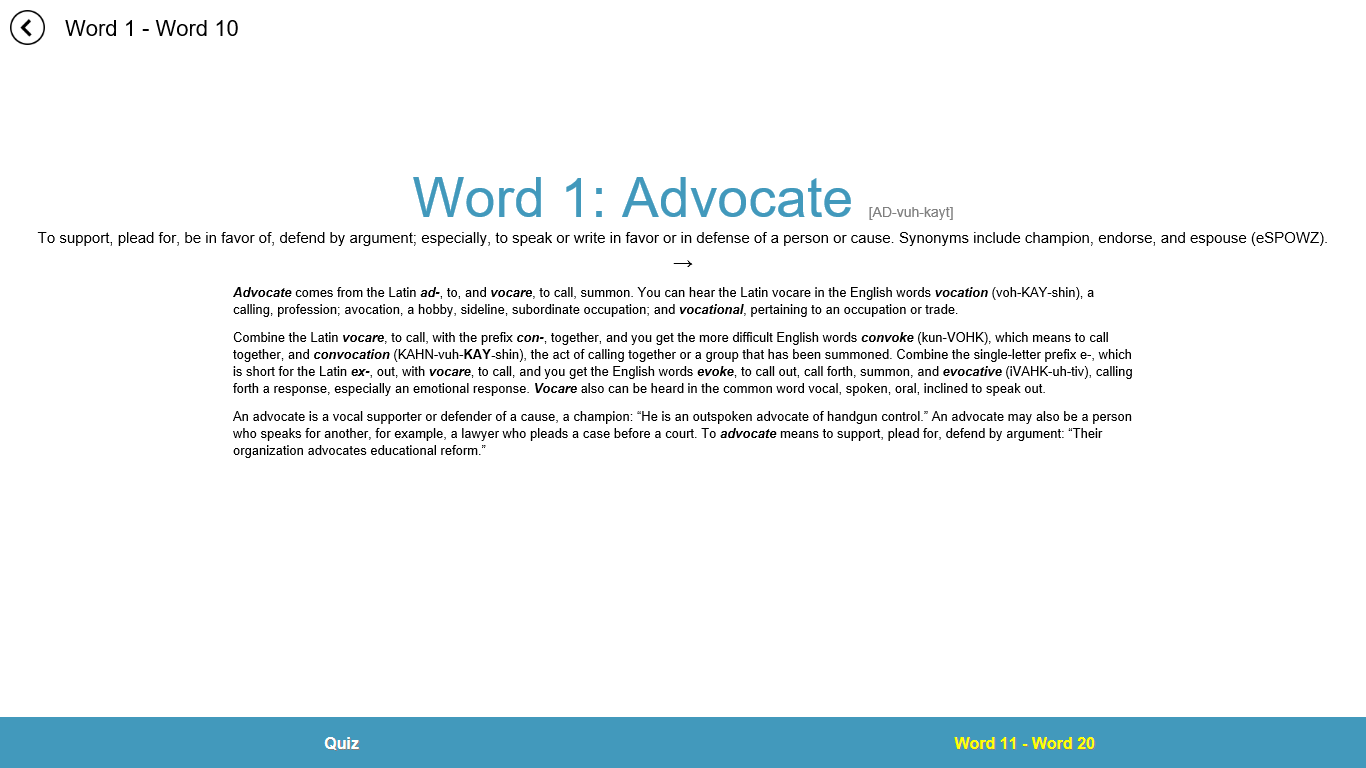 ข้อได้เปรียบทางวาจาให้ประสบการณ์การเรียนรู้ที่สมบูรณ์กับคำอธิบายที่ชัดเจนของความหมายประวัติคำประเพณีการออกเสียงและอื่น ๆ มากเกินกว่าที่เซสชั่นกวดวิชาสำหรับการทดสอบมาตรฐานหนังสือเล่มนี้ถูกออกแบบมาเป็นผู้สร้างคำศัพท์อายุการใช้งานการเรียนการสอนคำศัพท์ที่ใช้ร่วมกันโดยเฉพาะการคิดเป็นเปอร์เซ็นต์ด้านบนของชาวอเมริกันด้วยวิธีการพิสูจน์แล้วว่าช่วยให้ความรู้ที่ผ่านมา