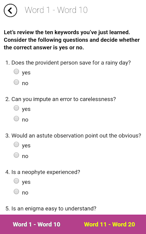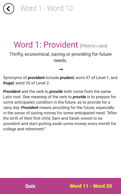 คุณจะดำเนินการผ่านระดับสิบของคำศัพท์แต่ละระดับที่ท้าทายมากขึ้นกว่าที่ผ่านมา ยกตัวอย่างเช่นระดับ 1 มีคำที่คุ้นเคยกับประมาณ 60 ถึงร้อยละ 70 ของผู้ใหญ่ที่เป็นคำที่รู้จักกันมากจบการศึกษาระดับสูงและมากที่สุดในบัณฑิตวิทยาลัย ในตอนท้ายของระดับที่ 5 ที่คุณจะได้ยกคำศัพท์ของคุณไปประมาณร้อยละ-ไตรมาสที่ด้านบน 75 ของผู้ใหญ่ที่มีการศึกษาทั้งหมด ในตอนท้ายของระดับ 8 คำศัพท์ของคุณจะได้ทะลุว่าผู้บริหารส่วนใหญ่และผู้เชี่ยวชาญรวมทั้งผู้ที่มีระดับสูง และเมื่อคุณเสร็จสมบูรณ์ระดับสิบและครั้งสุดท้ายที่คุณจะมีความก้าวหน้าเกินกว่าร้อยละ 95 ของประชากรทั้งหมด คุณจะสั่งคลังแสงของคำว่ามีเพียงไม่กี่คนในทุก ๆ พันสามารถจับคู่