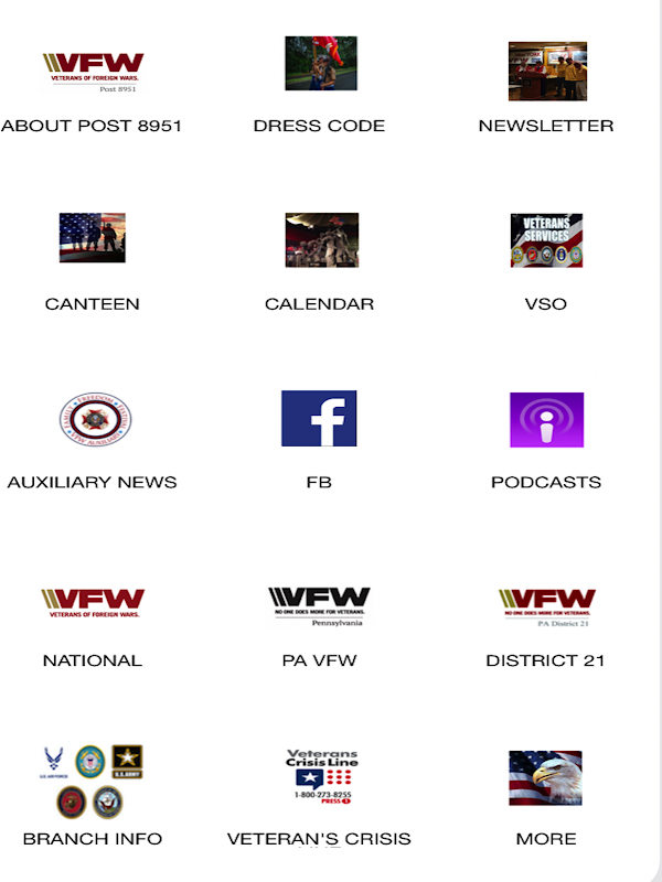 VFW มีรากฐานมาจากปี 1899 อย่างไรก็ตาม จนกระทั่งปี 1936 VFW ไม่ได้รับการอนุญาตจากสภาคองเกรสในระหว่างการบริหารงานของประธานาธิบดีแฟรงคลิน ดี. รูสเวลต์ โปรดทราบว่าเราไม่ใช่องค์กรของรัฐหรือมีส่วนเกี่ยวข้องกับองค์กรใดองค์กรหนึ่ง อย่างไรก็ตาม VFW Post 8951 ในเวสต์ยอร์ก รัฐเพนซิลเวเนีย ดำเนินภารกิจ VFW ระดับชาติในท้องถิ่น นอกจากนี้ เราขอแนะนำให้คุณทุกคนดูข้อมูลตั้งแต่ระดับชาติไปจนถึงโพสต์ของเรา นอกเหนือจากการไปยังโพสต์อื่นๆ ภายในเขต 21 เรารอคอยที่จะให้คุณเชื่อมต่อกับเราในวันนี้!